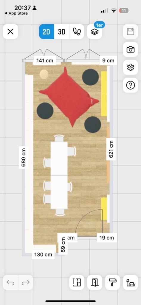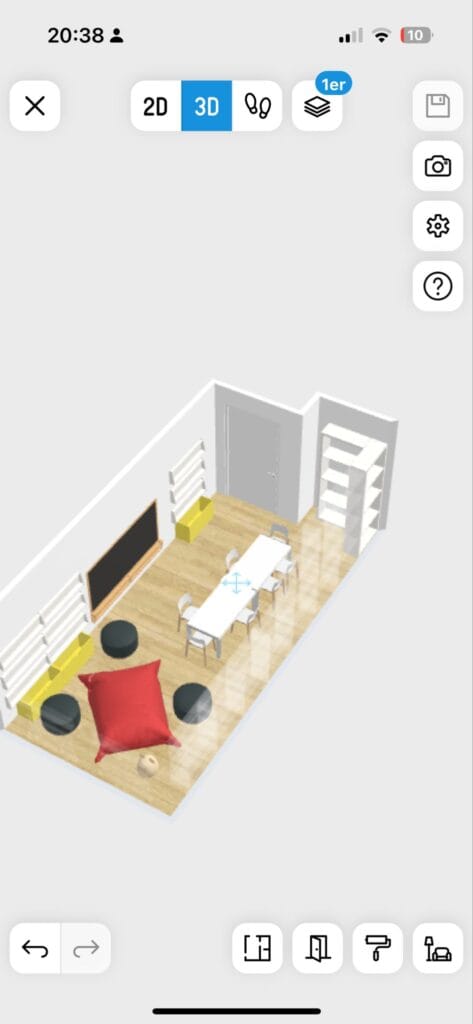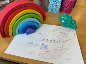 «Tenemos la habitación pintada, reparada instalación eléctrica y chapado y ESTA SEMANA (del 13 al 17 octubre) han vitrificado el suelo… Las estanterías que ves, nos las dona IKEA. La pizarra, la ha dotado consellería. Las mesitas y sillas y alfombras, etc. es lo que no tenemos.»