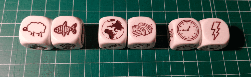 - Os facilitamos una imagen de seis dados, sacados al azar, del juego Rory’s Story Cubes ©.